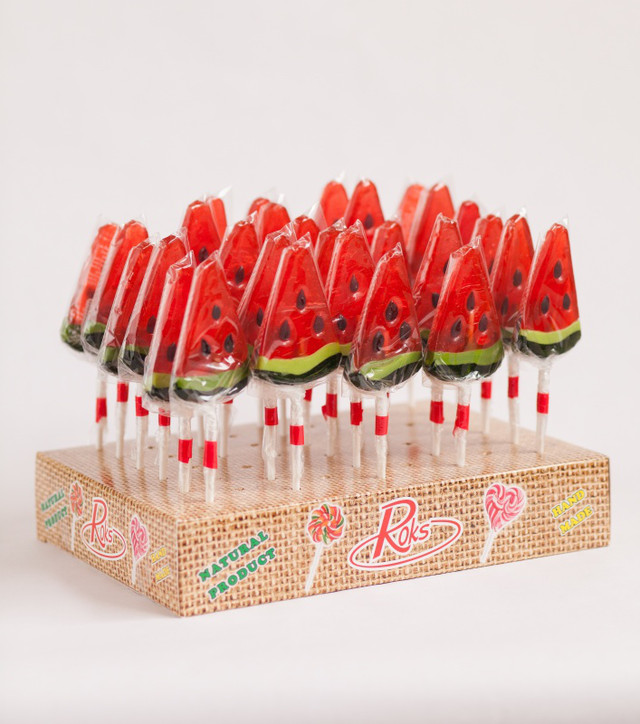 Льодяник виконаний у вигляді шматочки кавуна, трикутної плоскої форми, що повністю імітує оригінал: яскраво-червона серцевина, темні кісточки, насичений зелений край шкірки. Привабливий вигляд цукерки подобається і дітям, і дорослим.
